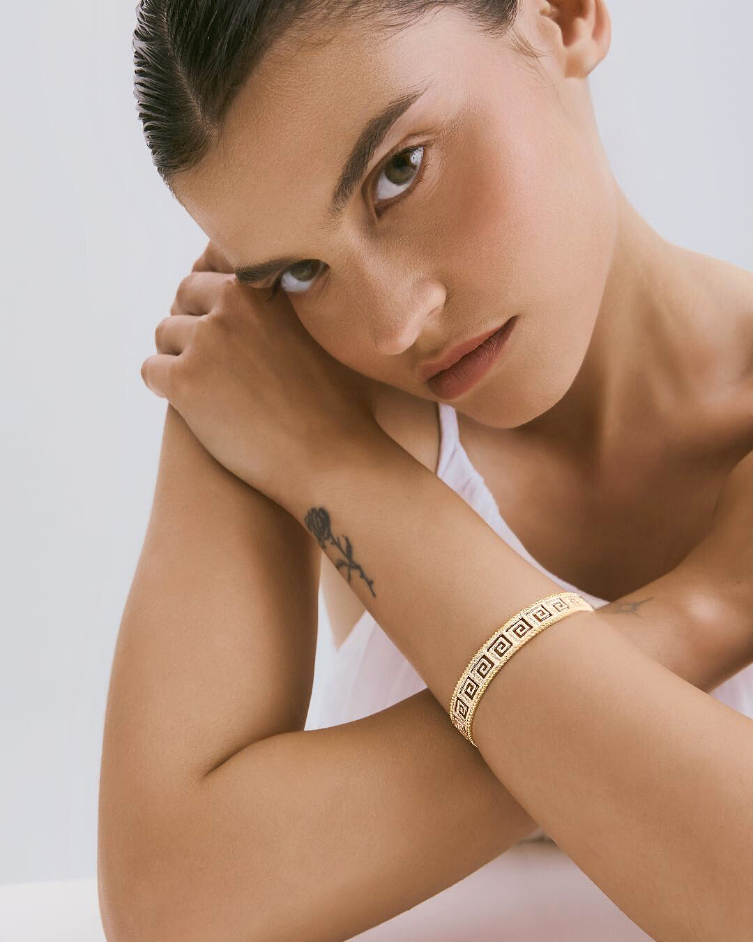 Bracciale rigido dal design contemporaneo con meandro centrale, simbolo di eternità e continuità.
