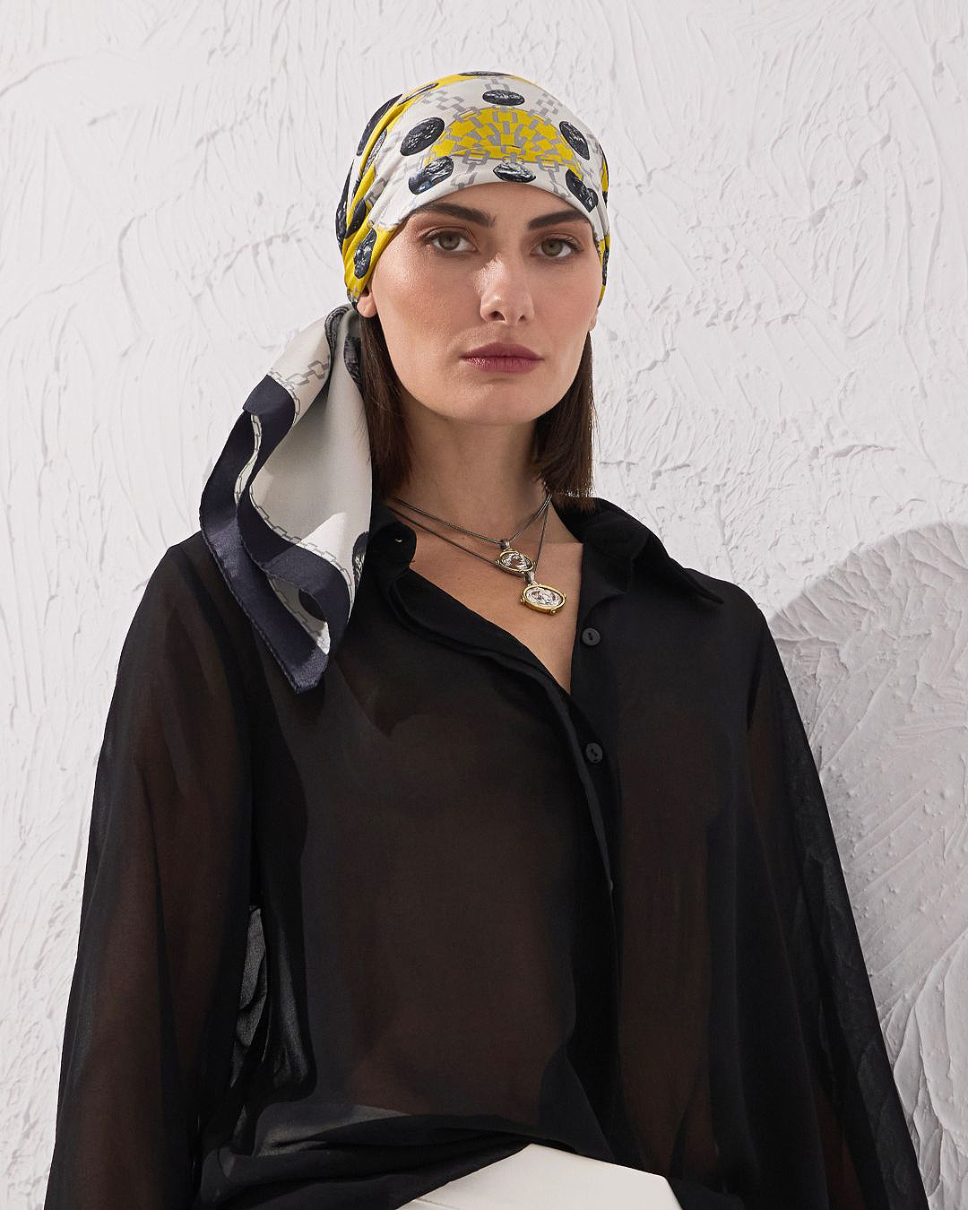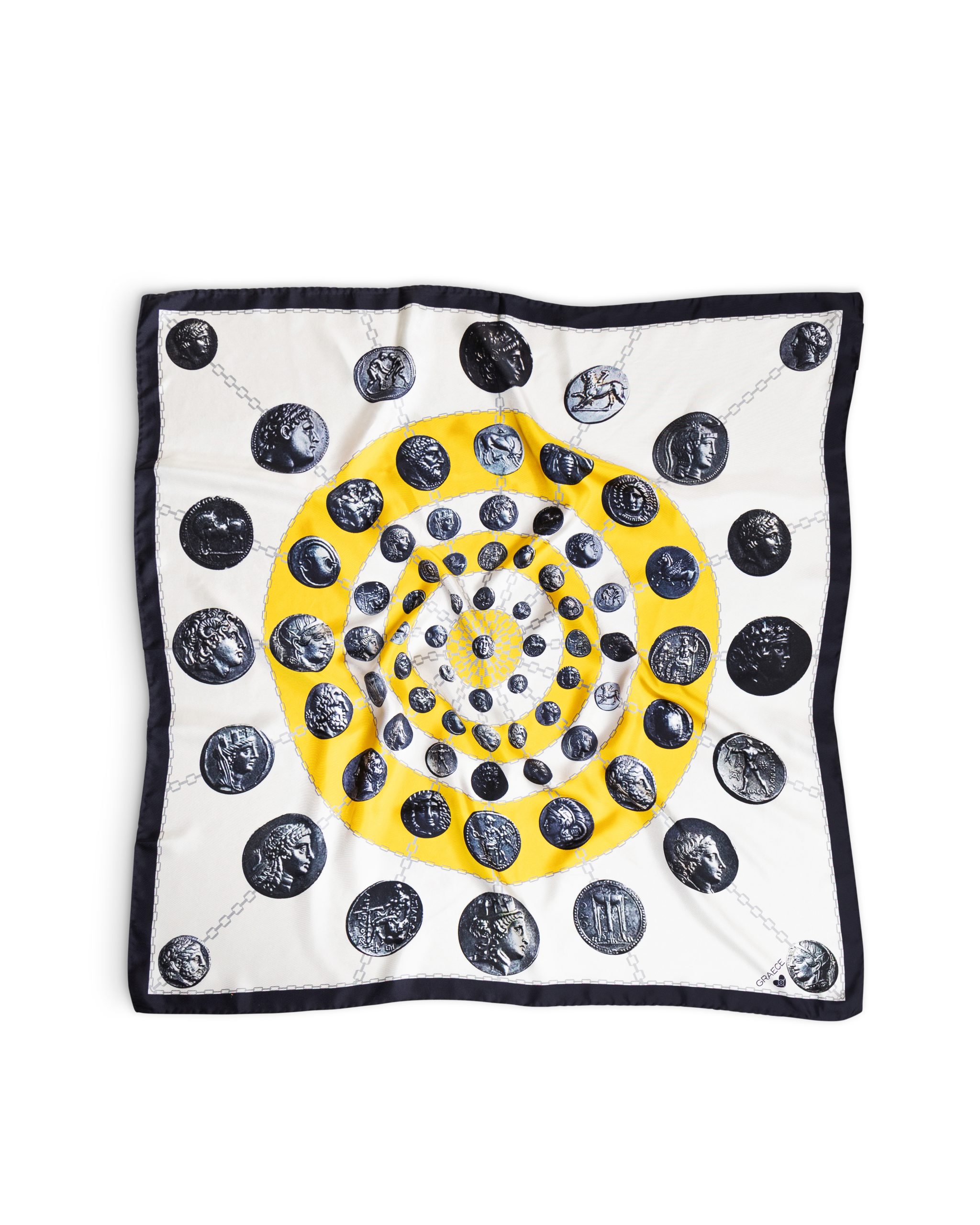 Realizzato in morbida seta, questo foulard unisce arte e stile in un accessorio iconico.
